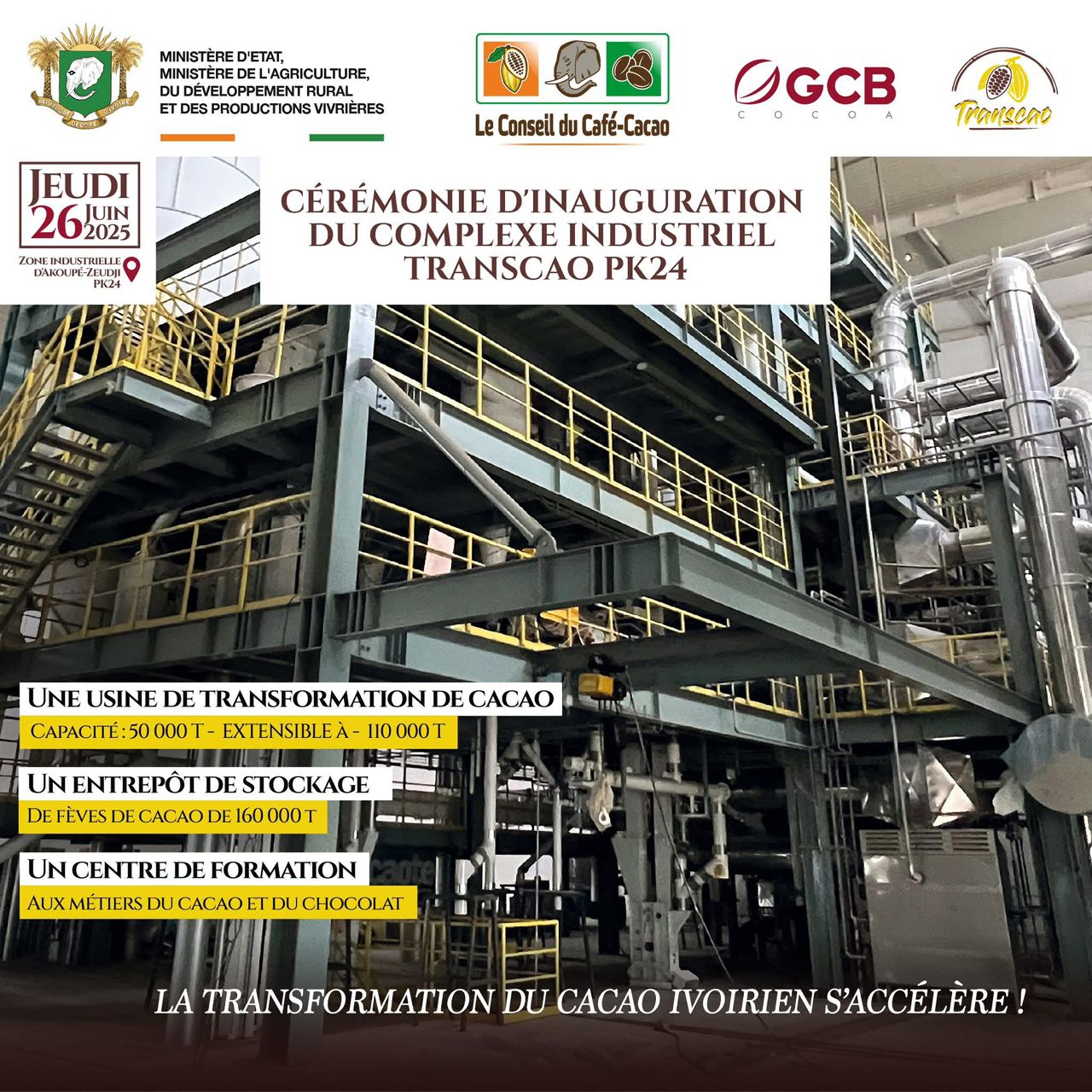 On Thursday, June 26, 2025, the Vice President of the Republic of Côte d’Ivoire, H.E. Mr. Tiémoko Meyliet KONE, officially inaugurated the TRANSCAO PK 24 industrial branch of the Conseil du Café Cacao by cutting the ceremonial ribbon.